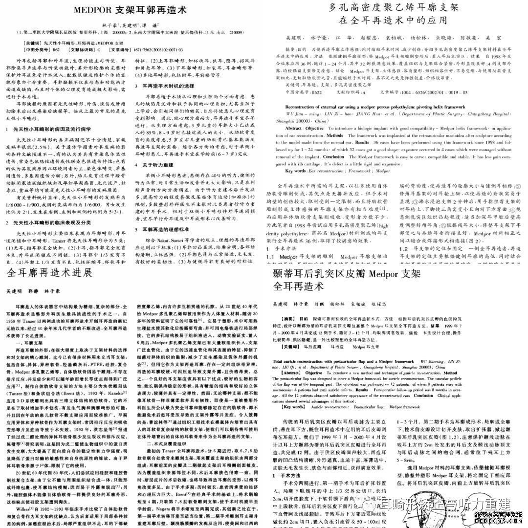 吴教授首创国内支架耳再造手术,一直钻研其中且硕果累累,作为国家自然科学基金耳部研究第一负责人,完成两项核心课题,参与编写学术专著四部,核心期刊发表论文30余篇,其中耳部研究论文12篇,相关专利五项(有两项尚在审核),把外露率控制在了1.5%之内。