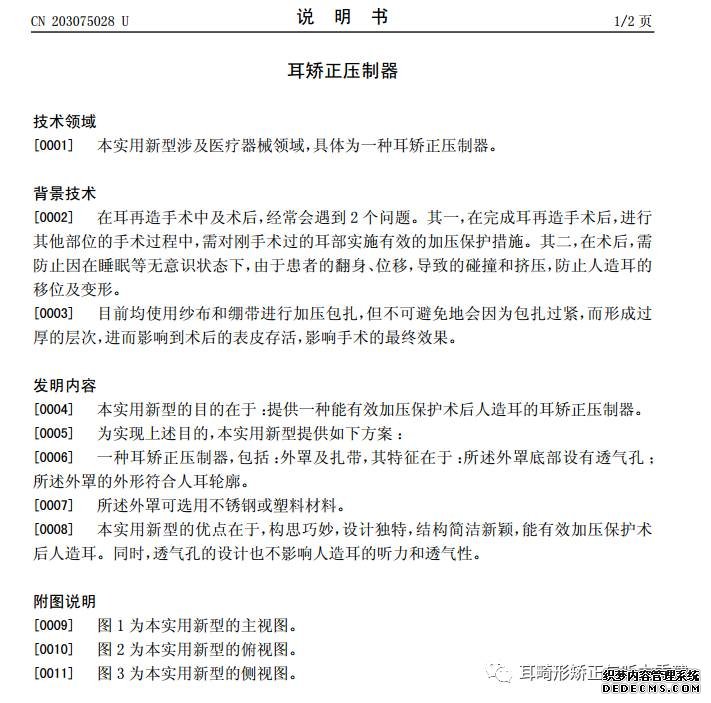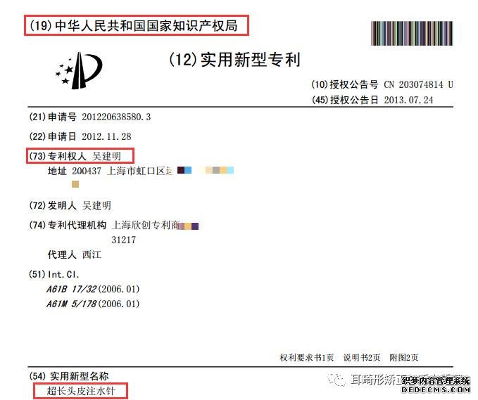 超长头皮注水针(专利号201220638580.3 ),改进了筋膜剥离技术,保护毛细血管网。在耳再造手术中覆盖筋膜,大大减少了支架外露,且再造耳内部结构神经组织和血管组织更加丰富。